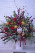 ~ドライ素材と赤バラの大きなアレンジ~ ユーカリ キンプロティア 赤バラなどを使った大きなアレンジメントです。 花が終わった後には、ドライ素材でスワッグを作り長く楽しめます。 サイズ:幅80cm×高さ80cm ※アレンジはイメージでおまかせ商品になります。時期により入荷出来ないお花もあります。 お花のお色やご要望がございましたらお申し付け下さい、出来る限り対応させていただきます。 ラッピングをしてお届け致します。